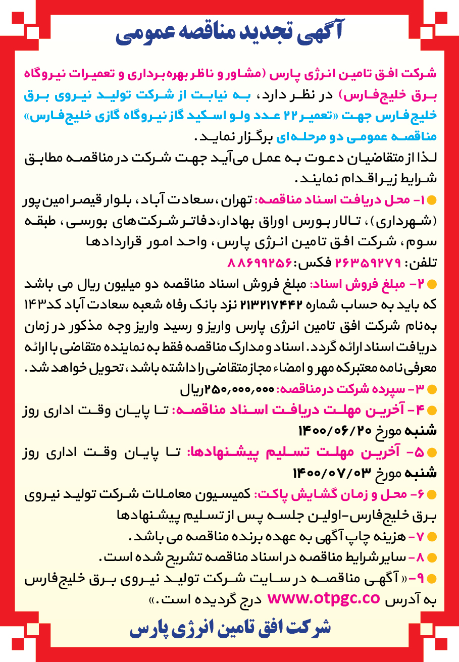 محل تحویل اسناد: واحد حراست شرکت تولید نیروی برق خلیج فارس