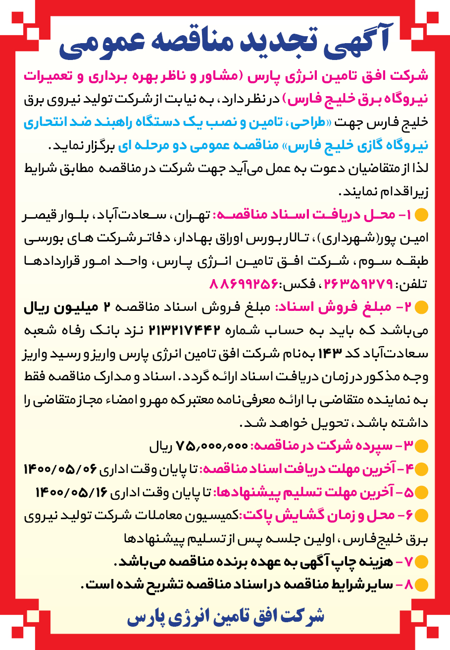 محل تحویل اسناد: واحد حراست شرکت تولید نیروی برق خلیج فارس