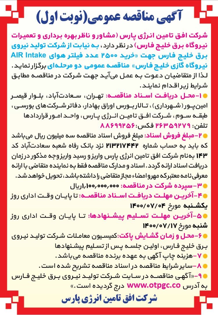 محل تحویل اسناد: واحد حراست شرکت تولید نیروی برق خلیج فارس - تهران سعادت آباد