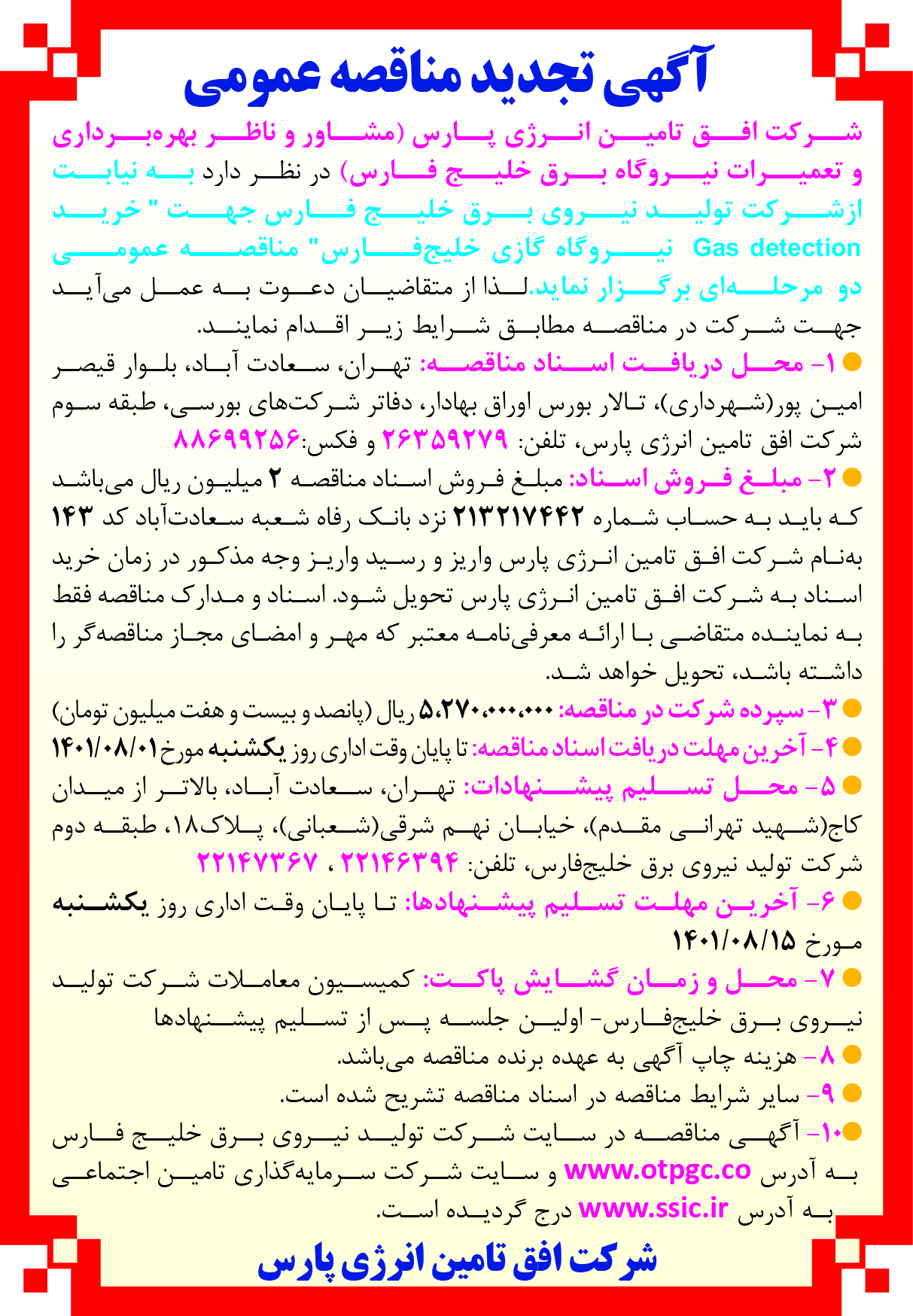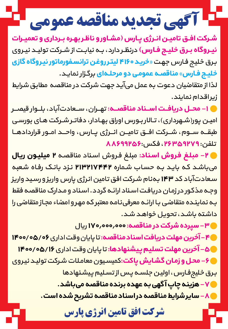 محل تحویل اسناد: تهران-سعادت آباد – بالاتر از میدان کاج – کوچه نهم – پلاک ۱۸ – طبقه دوم-شرکت تولید نیروی برق خلیج فارس -واحد دبیرخانه