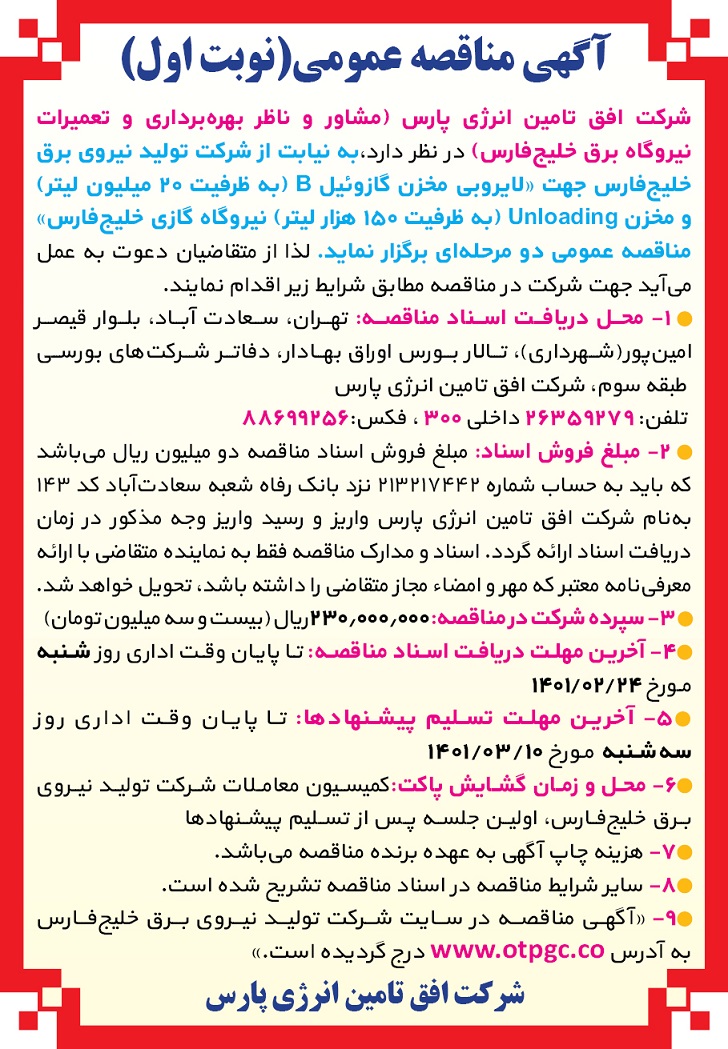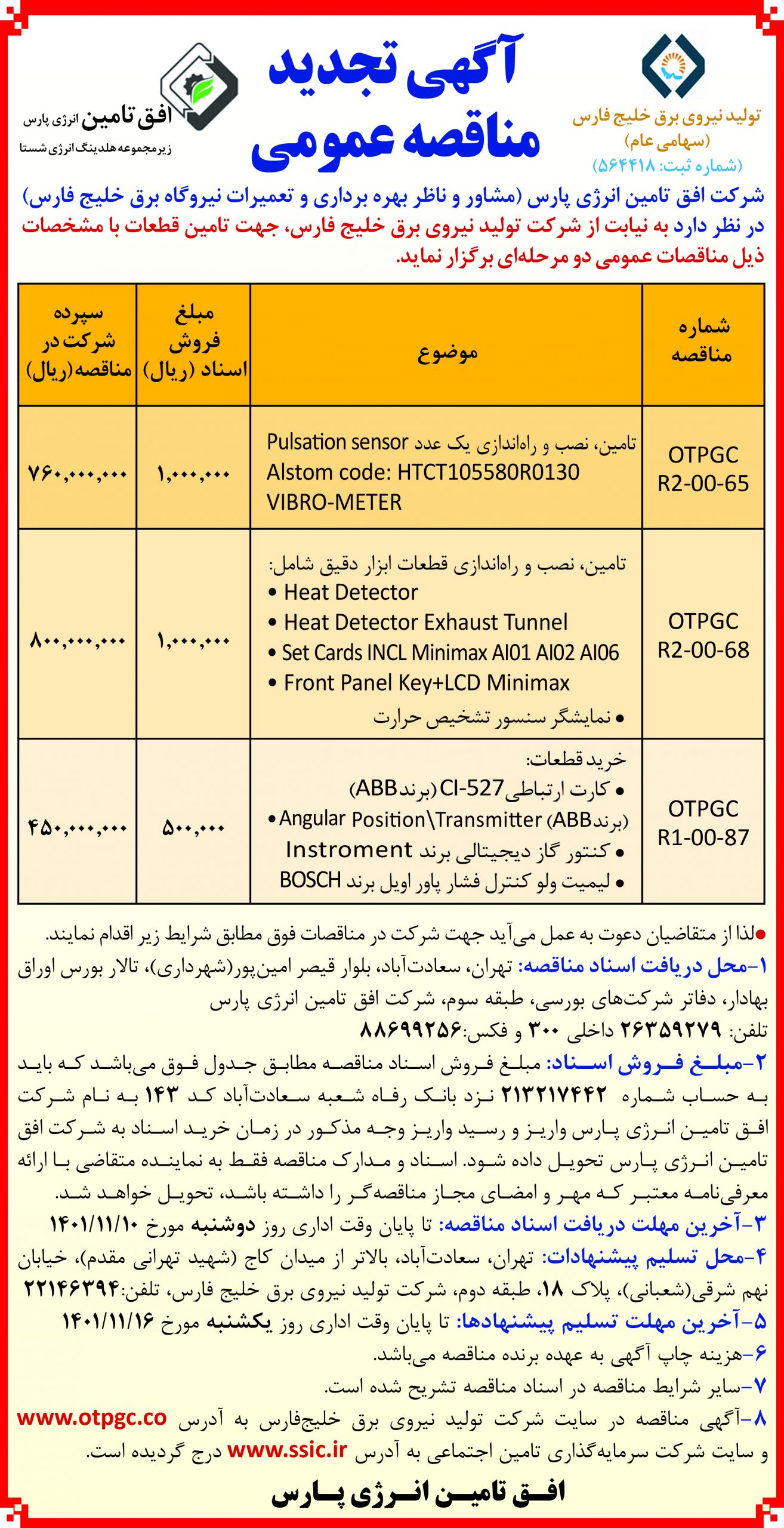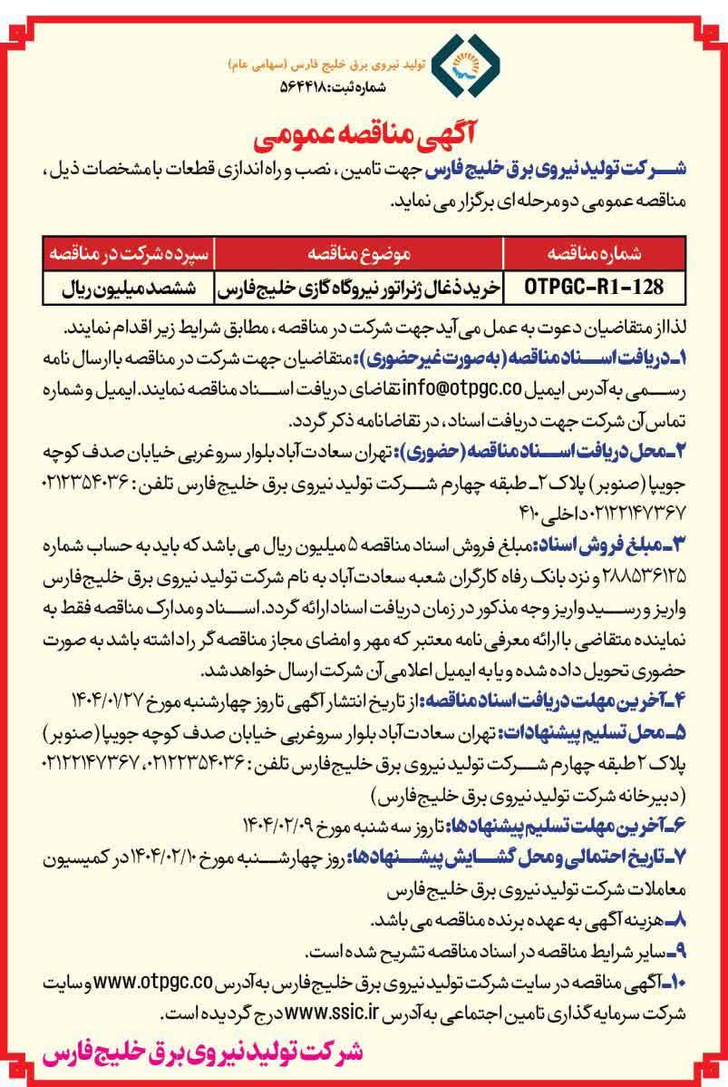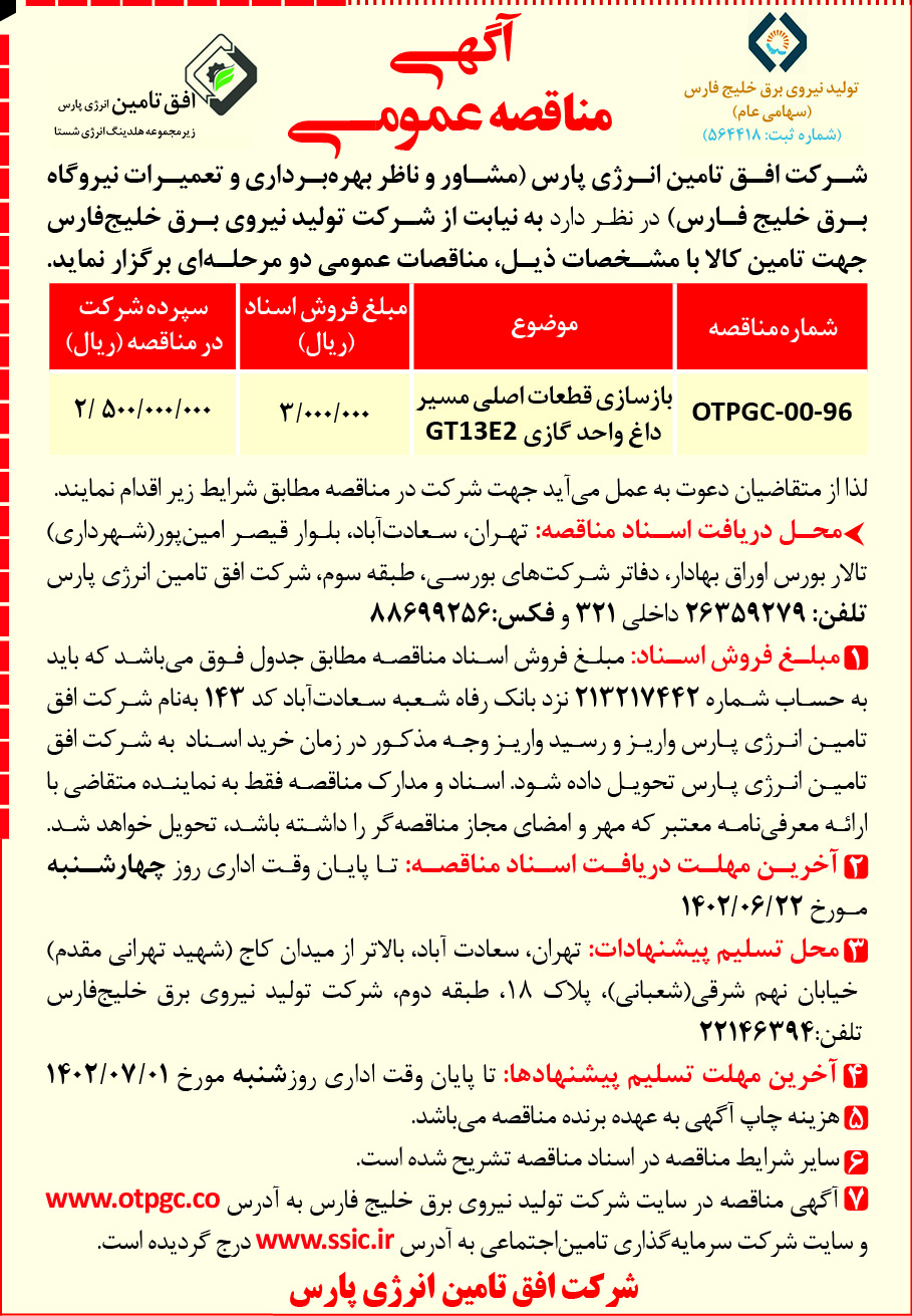 شماره مزایده: OTPGC-M-R1-01