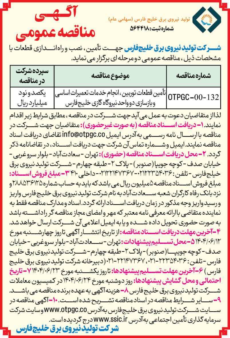 شماره مناقصه: OTPGC-R1-132